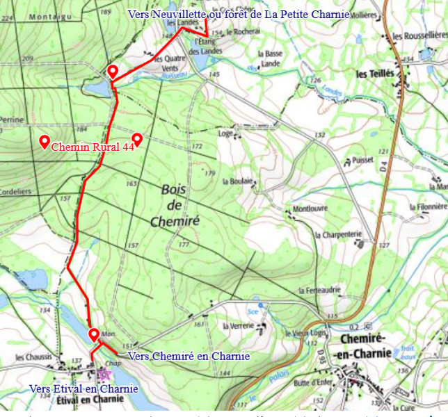 Du côté d’Etival, il démarre aux monuments à la mémoire des résistants pour rejoindre le lieu-dit des Quatre Vents sur la commune de Neuvillette-en-Charnie. De là, grâce au réseau des chemins de cette commune, on peut gagner le bourg de Neuvillette ou rejoindre les itinéraires pédestres de la forêt domaniale de la Petite Charnie et les sentiers balisés de la 4CPS.